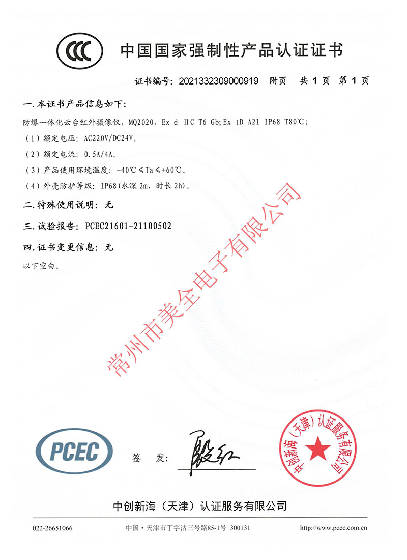 MQ2020防爆一体化云台红外摄像仪(3C证书)